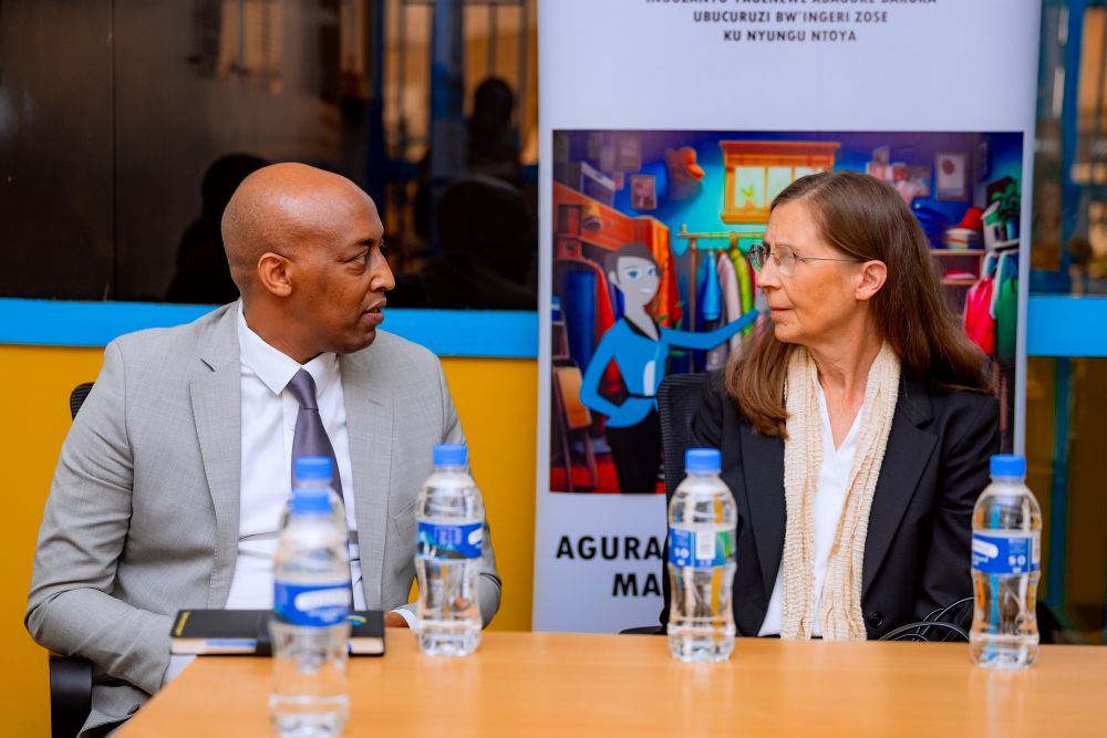 Uwitonze Jeannette (center, wearing a red jacket) praised the role of Duterimbere IMF Plc in her business growth.The Managing Director of Duterimbere IMF Plc Ngabonziza M. Alphonse speaks with Ambassador Heike Uta Dettmann.Duterimbere IMF Plc and the Government of Germany partner to train women.Ambassador Heike Uta Dettmann commended Duterimbere IMF Plc for helping women access financial services.. Ambassador Heike also visited some of the women-led projects supported by Duterimbere IMF Plc, including a clothing shop owned by Musabyimana Jeanne (right). Women working with Duterimbere IMF Plc praised it for transforming their businesses and driving their progress.