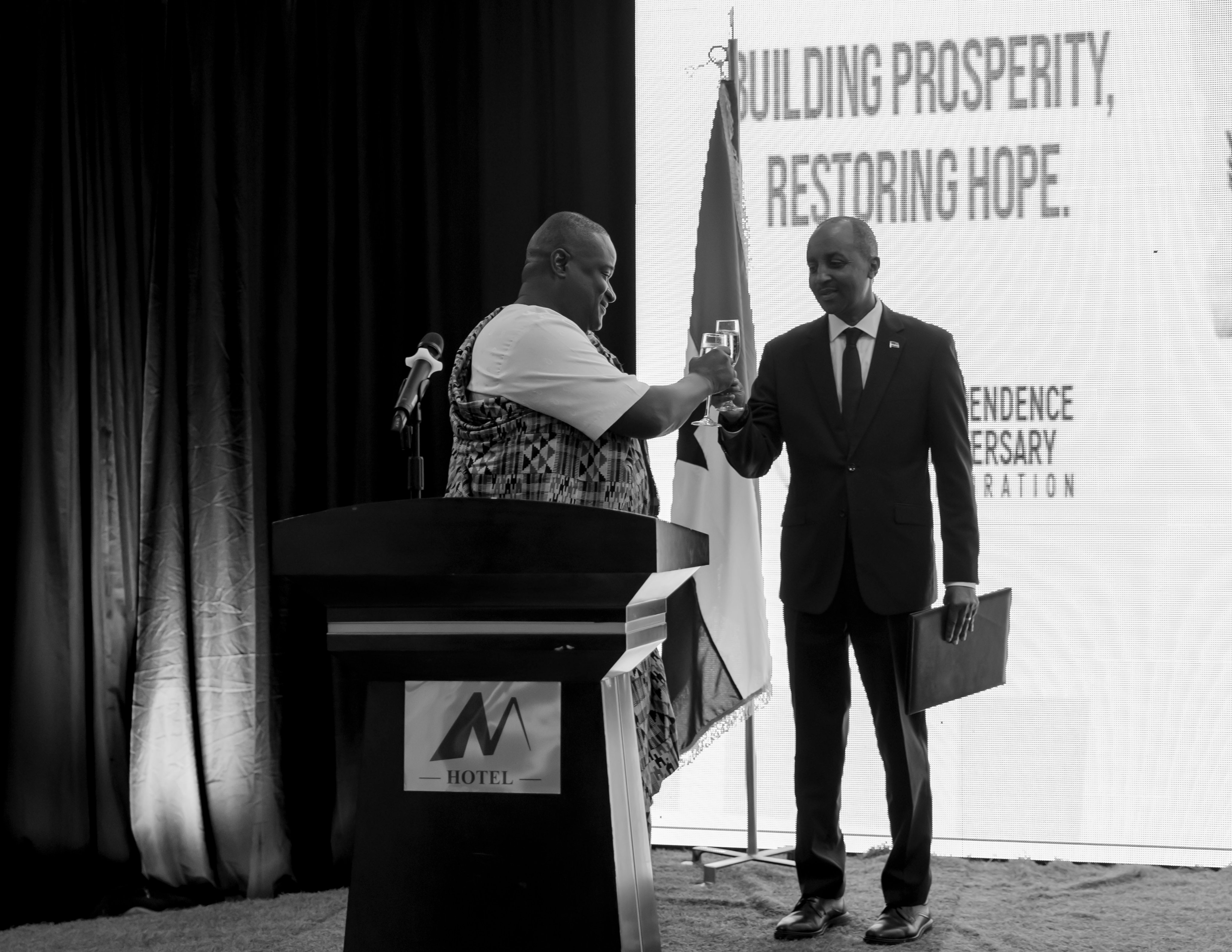 High Commissioner Amporful and Permanent Secretary in MINAFFET, Amb. Mironko pose together at the reception, symbolizing the strong ties between Ghana and Rwanda.High Commissioner Ernest Yaw Amporful and Permanent Secretary Fidelis Mironko toast to Ghana’s 69th Independence Anniversary at the Kigali reception on March 9, 2026.High Commissioner Amporful with Rwanda’s Permanent Secretary in the Ministry of Foreign Affairs, Amb. Fidelis Mironko, during the Independence Day reception at M-Hotel.Permanent Secretary Fidelis Mironko congratulated Ghana on its 69th Independence Day, emphasizing the importance of unity and shared action for Africa’s future.